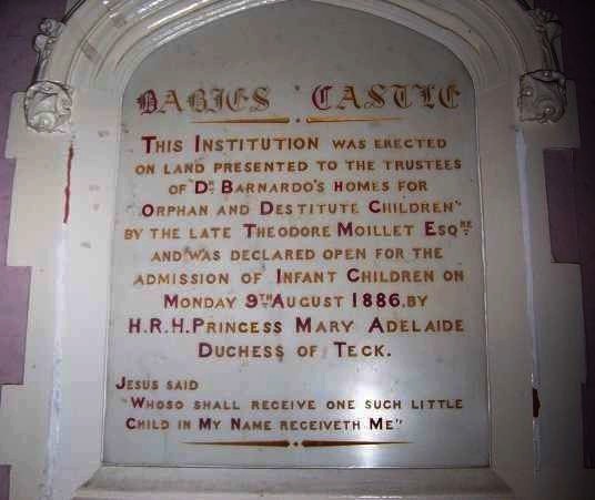 PlaqueAfter a dedicatory prayer, Dr. Barnardo briefly explained how the gift of two villa houses and land had enabled him to provide for infant children in Hawkhurst. The reporter for the Daily News wrote, "The exact amount of the building contract was £3,747. The whole of the furniture has been designed and arranged by Messrs. Maple and Co., of Tottenham Court Road, and it was expected that the cost would not exceed £700. A number of ladies then presented purses, each purse containing not less than £10, after which a collection was made, the hand-bell ringers, consisting of boys belonging to the Homes, playing in the meanwhile. A procession of infants awaited the opening of the central doors by the Princess, with a silver key presented by the architect. Having thrown the doors wide open, the Princess said, 'I declare this building open, and may God's blessing attend it.'" She then unveiled a tablet in the porch in memory of Mr. Theodore Moillet, the donor of the site and the adjoining house. The company then proceeded to a marquee outside, where luncheon was provided, Mr Gurney Shephard presiding. No toasts were proposed afterwards, and no speeches made, but Dr. Barnardo stated that the sums contributed that day amounted to £263.