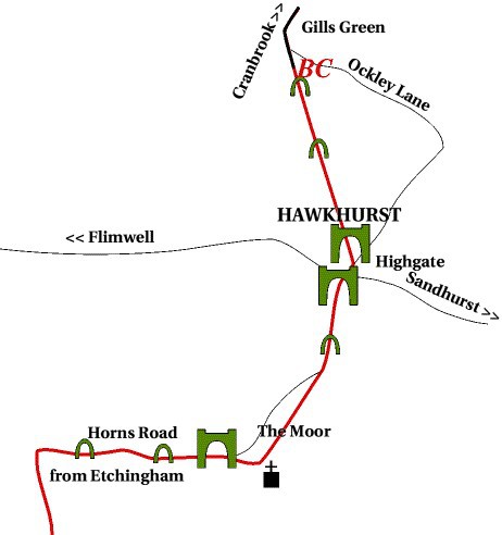 Map of Royal party's route Map of the route (marked in red) taken by the royal party from Etchingham, showing the positions of the many decorative arches en route. The three erected by the Hawkhurst Committee are shown with towers.