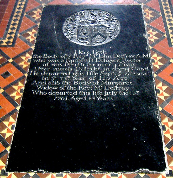The End of his Life John Deffray died in 1738 and is buried in the chancel of Old Romney church under a magnificent tombstone bearing his French coat-of-arms. His funeral is described in the diary of Thomas Miller, a member of the New Romney religious Society and formerly master of their school. The six pall-bearers were all ministers, and the sermon was preached by Robert Payne, Rector of Saltwood, to whom Deffray left "my father’s Calmet’s dictionary in three volumes", in his will. He was survived by his Huguenot wife Margaret, whom he had married in 1692, though the union was childless.His Influences It is not yet known how long the Religious Societies continued to perform their original roles of religious study, teaching children and leading congregational singing or whether any of them developed into a Society of Psalm Singers, as the West Gallery choirs used to be known. However, in 1757, soon after being appointed parish clerk of Lydd, where there had been a Religious Society, John Hill published A New Book of Psalmody. As parish clerks of the period were often barely literate and unmusical, it is tempting to conclude that Lydd was keen to continue Deffray’s plan by encouraging this talented composer, so the title of his book may be significant, but as yet no evidence has been found. Perhaps more significant is the fact that Samuel Wesley, father of John and Charles, read Deffray’s letter in Woodward’s book and was inspired to set up a Religious Society in Epworth in 1702, with considerable success. John Wesley himself started one in Savannah, Georgia in 1736, and another in Fetter Lane in 1738. Although more evidence is needed, it is surely not impossible that Deffray’s idea engendered the hugely important role that music was to play in the later development of Methodism. |
